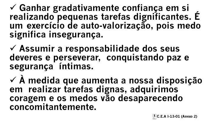 ü Ganhar gradativamente confiança em si realizando pequenas tarefas dignificantes. É um      exercício de auto-valorização, pois medo significa insegurança.